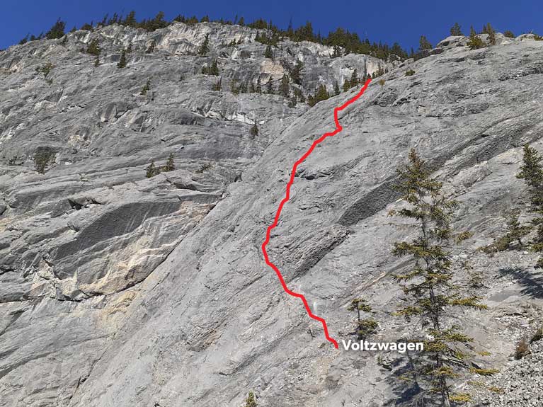 Drop your packs at the large dugout which is 30 meters south of the cliffs base, and gear up there. Climbers on P1 of Voltzwagen will potentially drop rock on the start of AA.